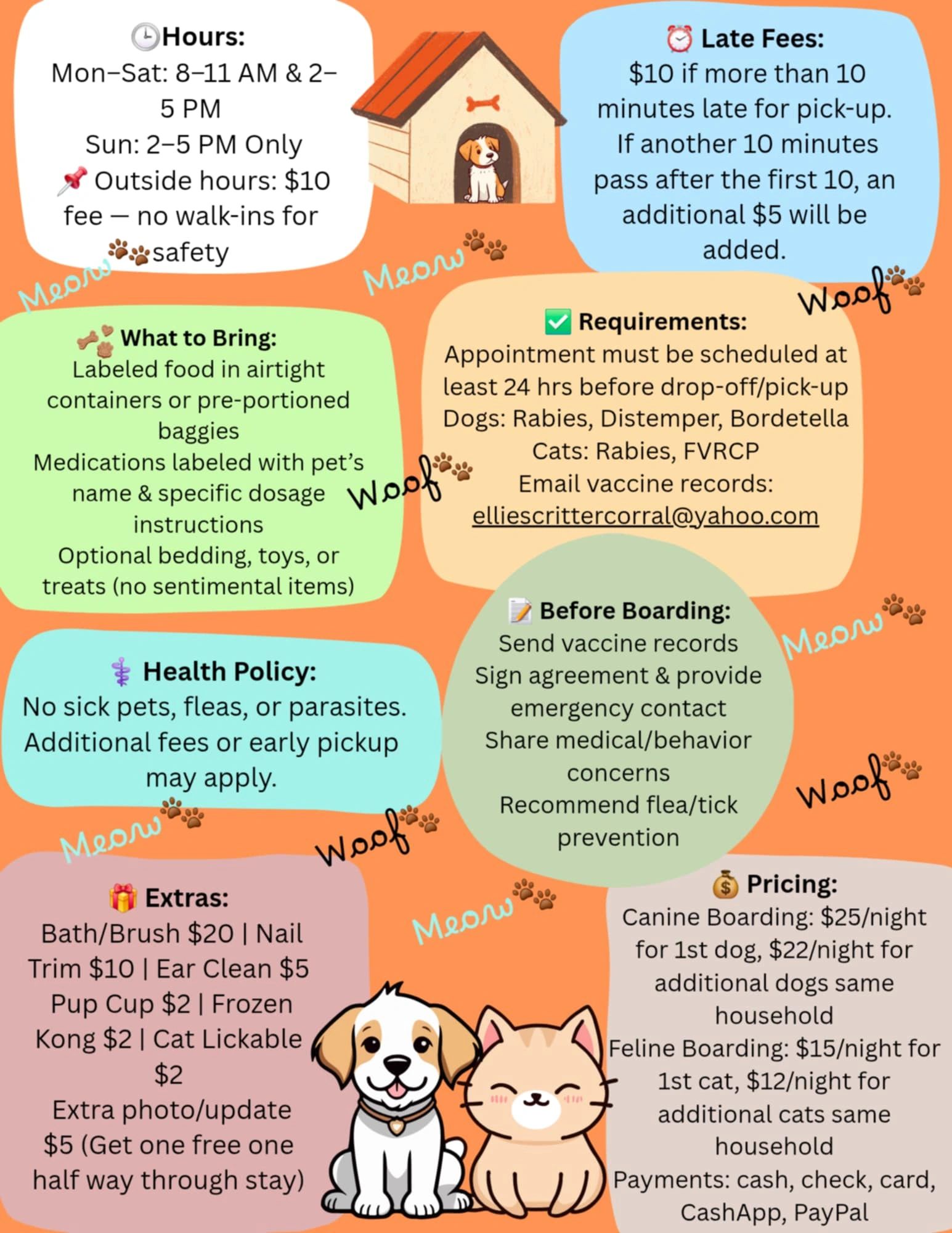 Please have vaccination records emailed to elliescrittercorral@yahoo.com prior to your reservation.